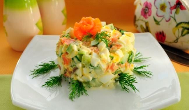 Для салата используют филе любой красной рыбы, нарезая его тонкими ломтиками или кубиками. Это может быть семга, горбуша, форель, кета и пр. В зависимости от рецепта, понадобится копченая, вареная или соленая рыба.