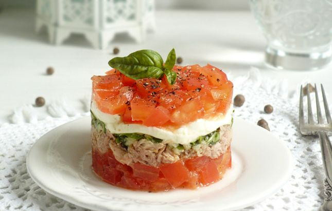 Салат из копченого лосося, моцареллы и вяленых томатов