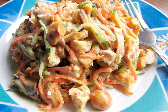 - Маслины порежьте как обычно это делаете. Смешайте все продукты, добавляем морковь по-корейски. Заправьте майонезом и можно подавать.