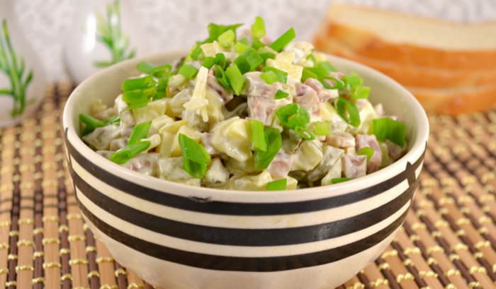 Это отличный вариант салата довольно сытный. Он вполне может выступать не только в качестве закуски, но и как основное блюдо. Их можно подавать на праздничный стол или на обычный семейный обед.Ингредиенты: