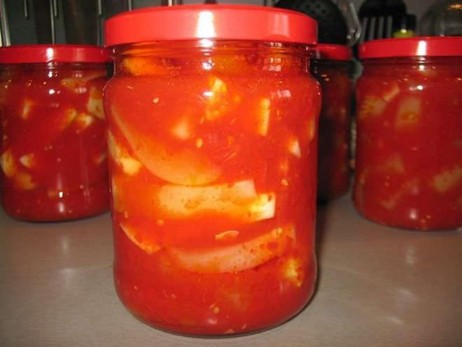 - Разложить кабачковые “язычки” в стерилизованные банки, доверху залить томатным соусом. Банки закатать крышками, перевернуть и укутать одеялом до полного остывания.