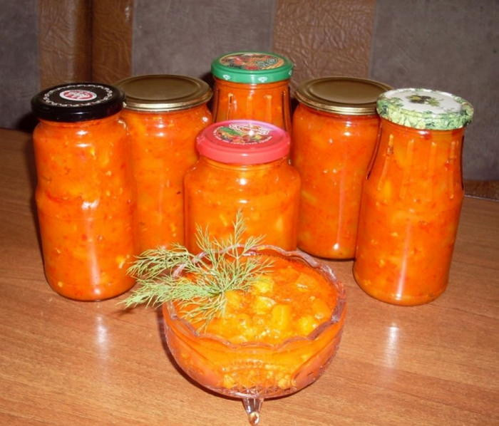 - В кастрюлю с нарезанными кабачками добавить. Затем добавить томатный соус, гвоздику, черный перец горошком, сахар, соль, воду и растительное масло. Нарезанные сладкий и горький перцы, чеснок.