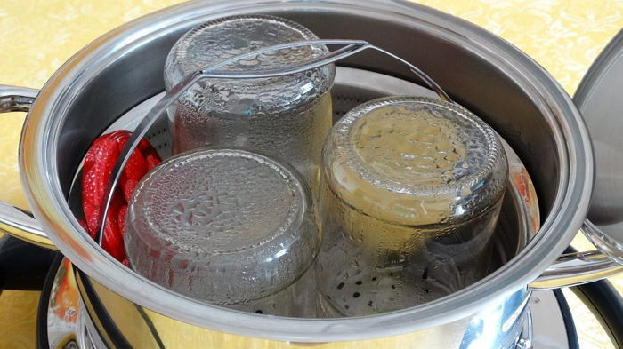 Доводим воду до кипения и, после закипания воды, стерилизуем банку объемом 0,5- 0,75 – 10 минут; литровые банки стерилизуют 15 минут; двухлитровые- 20; трехлитровые- 25-30 минут.