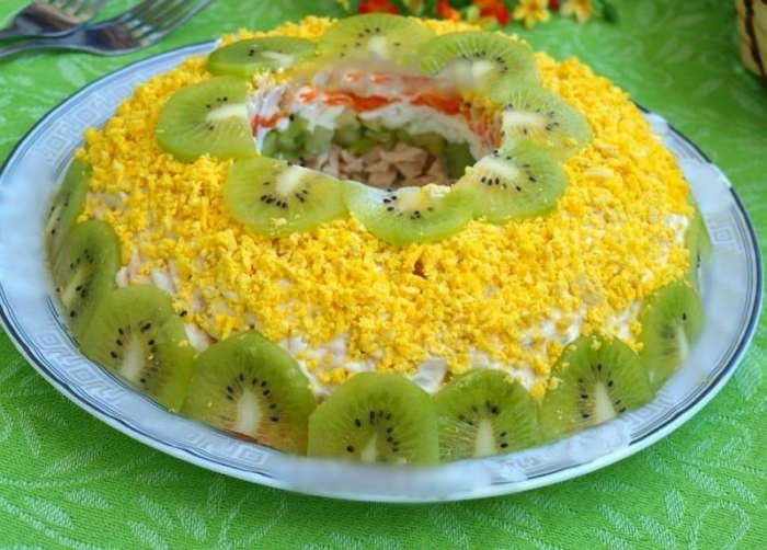 - Верхний слой браслета немного подмазать майонезом и украсить тертым желтком и дольками киви. Также киви выложить вокруг салата, затем осторожно вынуть банку из центра. Готовый салат отправить на час в холодильник для пропитки, после можно подавать на стол.
