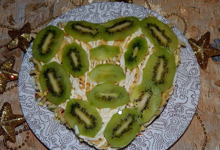 - Поверх яблока натрите сыр. Смажьте хорошо майонезом. Украсьте кружочками киви. Поставьте салат пропитываться на один час в холодильник.
