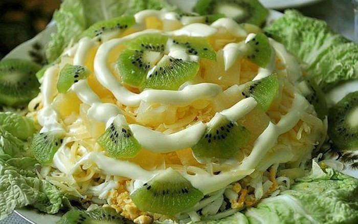 - Последним слоем салата с курицей и ананасом выложить натертый сыр, оформить кружками киви.