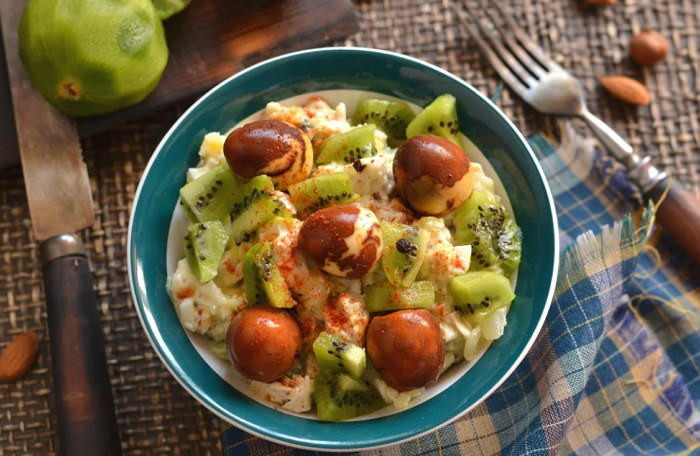 - Украшаем куриный салат с киви и орехами перепелиными яйцами, вымоченными в соевом соусе и кусочками киви, посыпаем сладкой паприкой. Сразу подаём к столу.