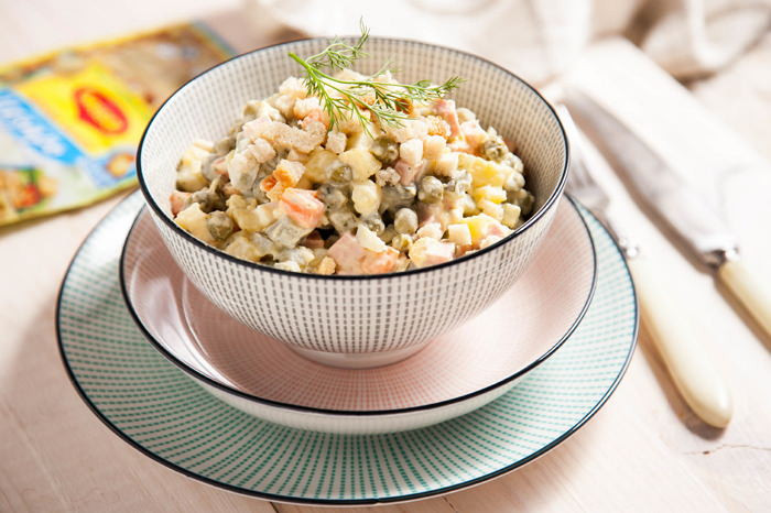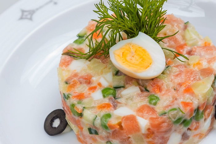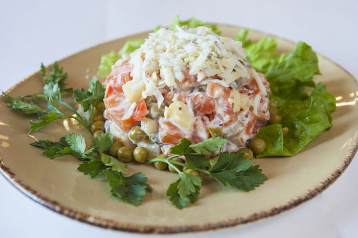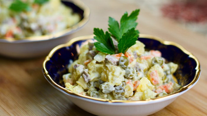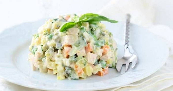 Обыкновенный (классический) рецепт “Оливье” изначально во Франции готовился только с мясом жареных рябчиков, смешанным с отварным картофелем, свежими огурцами, каперсами и оливками. Заправкой являлся таинственный в ту пору легкий соус “Прованс”, или “Провансаль”. Верх украшали раковые шейки, куски застывшего желе под названием ланспик и листья укропа. Простым такой состав назвать сложно – этот вариант могли позволить себе лишь обеспеченные люди, а никак не домохозяйки.Постепенно ингредиенты заменились более простыми, а в советское время устоявшийся вариант со свежими огурцами, вареными яйцами, картофелем и колбасой стал общепризнанно новогодним. В быстрый и понятный рецепт добавился зеленый консервированный горошек, майонез, иногда – вареная морковь.