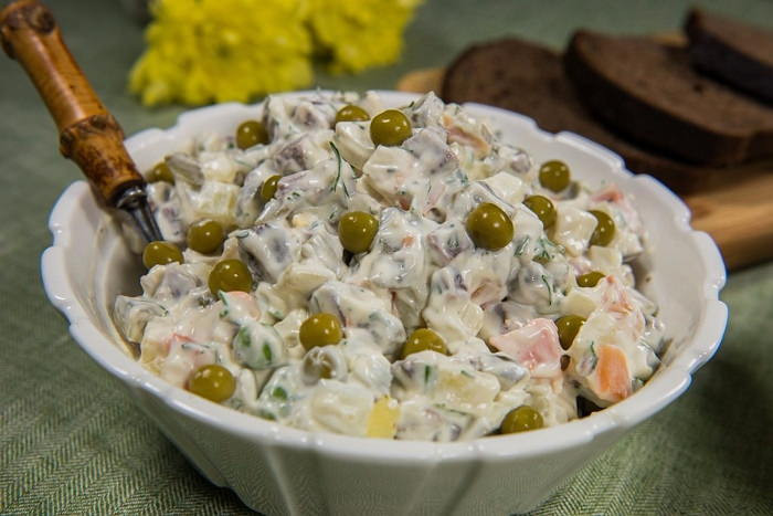 Постепенно ингредиенты заменились более простыми, а в советское время устоявшийся вариант со свежими огурцами, вареными яйцами, картофелем и колбасой стал общепризнанно новогодним. В быстрый и понятный рецепт добавился зеленый консервированный горошек, майонез, иногда – вареная морковь.