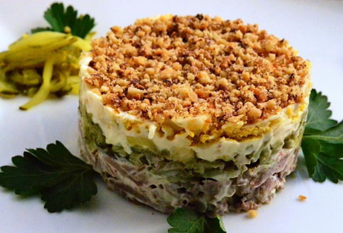 - Салат выкладываем слоями: мясо, огурцы с чесноком, отварные яйца. Каждый слой обмазываем тонким слоем майонеза. Сверху посыпаем орехами. И ставим в холод на несколько часов.