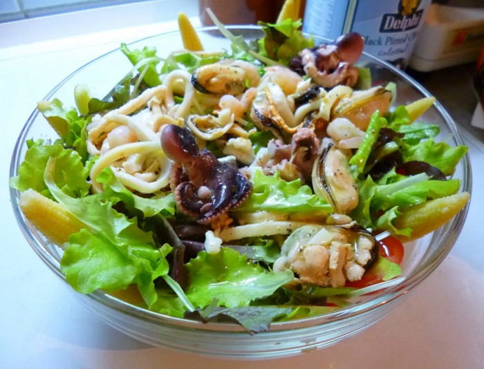 - Переложить горкой в блюдо морепродукты с нарезанными томатами, натертым сыром, салатом и маслинами, полить соевым соусом и перемешать, в дополнение к заправке готового блюда добавить сок лимона либо грейпфрута, петрушку и укроп.