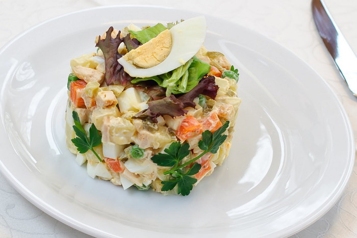 - Перед подачей заправьте салат «Оливье» с курицей майонезом.