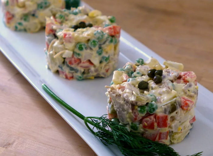 Кулинарам в 1904 году удалось, зная основные ингредиенты, восстановить рецепт настоящего салата Оливье. Таким образом, чтобы приготовить этот оригинальный салат, необходимо было иметь под рукой следующие продукты: паюсная икра — ¼ фунта, два рябчика, телячий язык, раки отварные — 25 штук, соя кабуль — ½ банки, два свежих огурца, полфунта свежего салата, полбанки пикулей, каперсы — ¼ фунта и пять яиц, сваренных вкрутую. Для приготовления соуса требовался французский уксус, два яйца и прованское масло (оливковое) – 1 фунт (тот же майонез провансаль).
