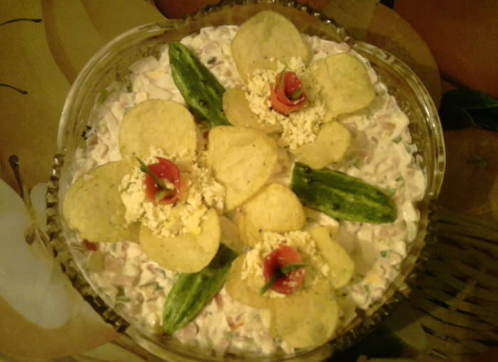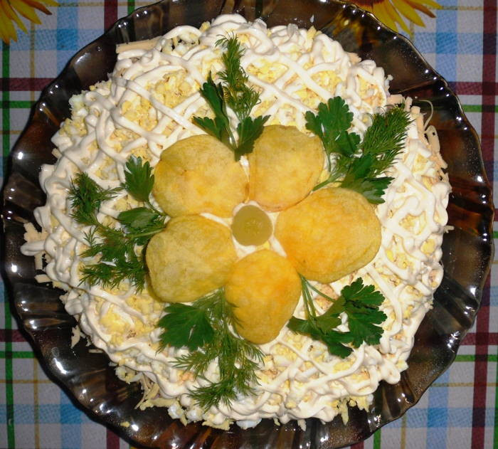 - Из оставленных чипсов сформировать цветок в центре салата, украсить зеленью. Дать пропитаться салатику в холодильнике минут 15 и можно подавать к столу.