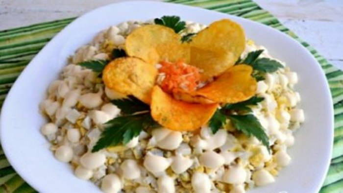- Отваренные яйца разделите на белки и желтки. Белки натрите на мелкой терке и выложите следующим слоем. Сверху снова смажьте майонезом. Из картофельных чипсов и измельченного желтка сделайте орхидеи. Украсьте зеленью по вкусу.