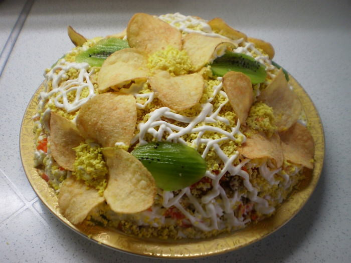 - Следующий слой – поломанные чипсы, 5 -7 штук самых ровненьких чипсов оставить для украшения, майонезом не смазывать.