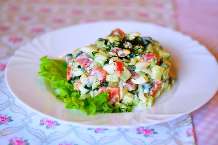 - Если в блюде используются свежие огурцы, то можно их порезать, оставить для выхода сока, отжать и только потом смешивать с остальными компонентами. Так блюдо сохранит свою форму, не станет водянистым.