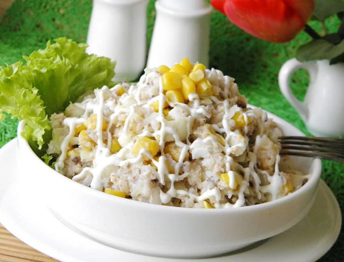 Рыбный салат с рисом и кукурузой