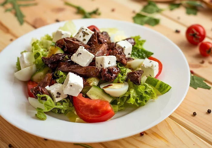 - На дно порционных тарелок выложить листья салата, перемешанную часть салата в середину. Добавить к салату фету кубиками, оливки.