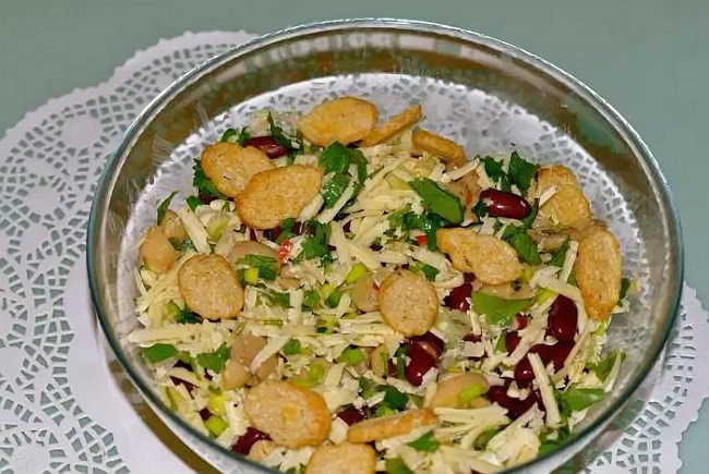- Очень важно всыпать сухарики непосредственно перед подачей блюда, чтобы они не успели размокнуть и остались хрустящими. Разложить салат по порциям и присыпать рубленой зеленью.