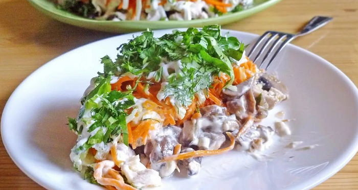 - Нарезанные грибы, курицу, яйца, морковь сложите в глубокую посуду, перемешайте, посолите. Заправьте майонезом. Салат можно сразу подавать к столу.