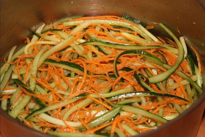 - Соломкой нарезать и морковь. После чего морковь посолить и оставить на 30 минут. После 30 минут отжать выделившийся сок.