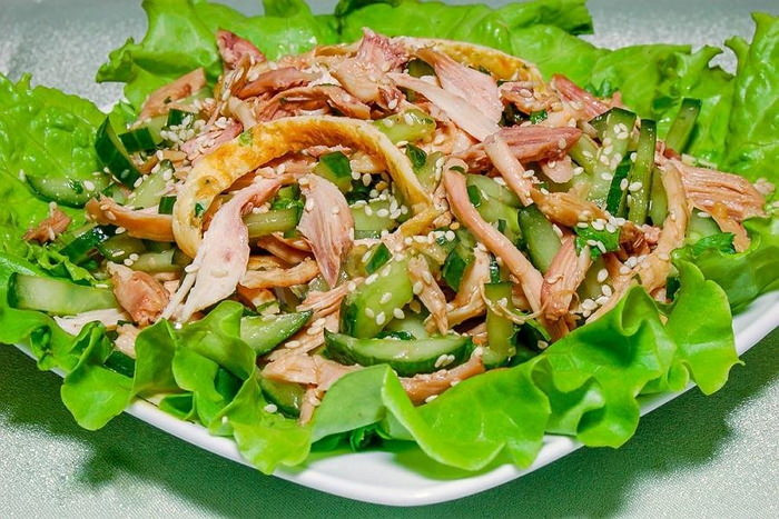 - Кладём порезанный тонкими полукольцами огурец, тоже перетираем с солью. Оставляем на 30 минут овощи. Далее кладём овощи в дуршлаг, промываем холодной водой, отжимаем. Кладём отжатые овощи в миску, добавляем порезанное тонкими ломтиками куриное филе.