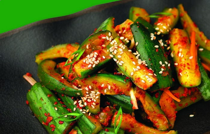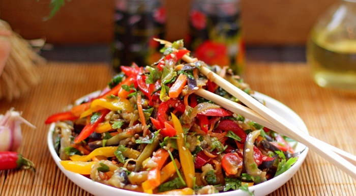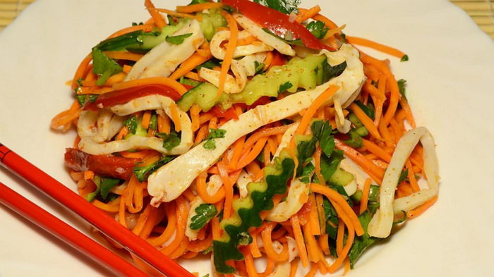 Корейские салаты очень популярны. Они готовятся как из сырых, так и из маринованных, квашеных или вареных овощей. Основные компоненты салата нередко дополняют грибами, рыбой или мясом. Главный секрет восточных салатов заключается в острых приправах и соевом соусе. К примеру, специфический вкус корейской моркови создается с помощью красного перца, который обжаривается на огне и затем быстро охлаждается. Без тепловой обработки такой перец был бы почти непригоден в пищу для европейца, но термическое воздействие «съедает» жгучесть и адаптирует перец к европейскому вкусу.