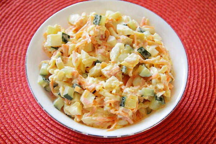 - Добавьте пропущенный через пресс чеснок, майонез и соль по вкусу. Перемешайте. Салат корейский “Калейдоскоп” готов.