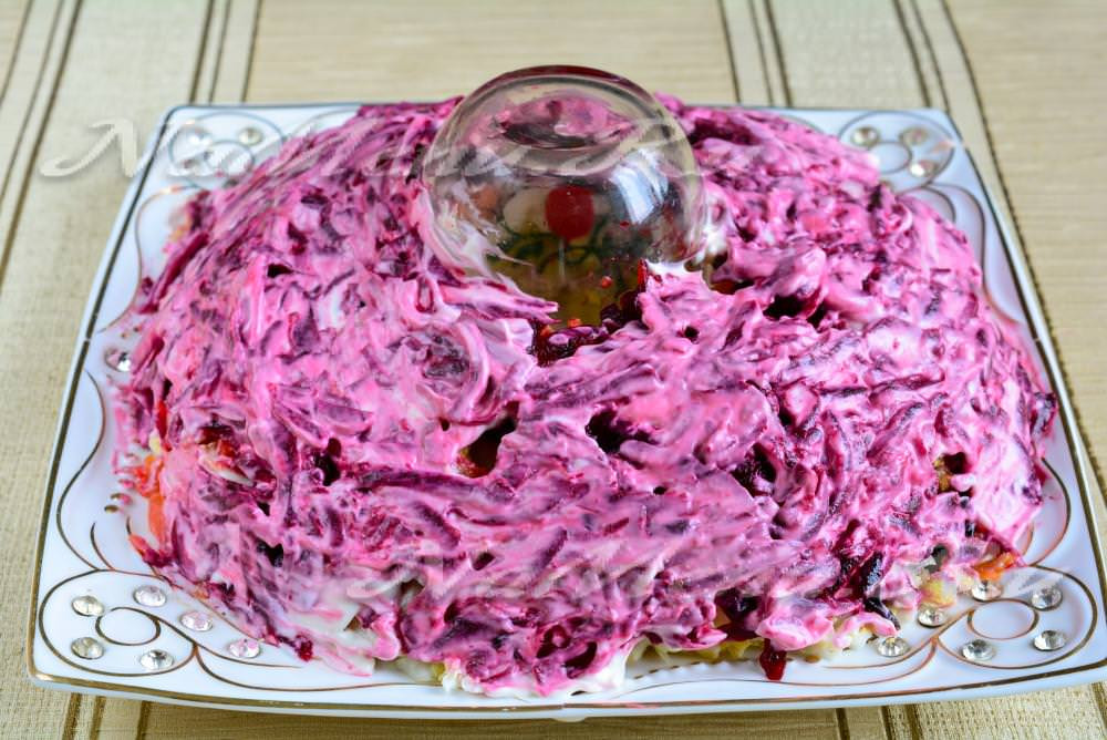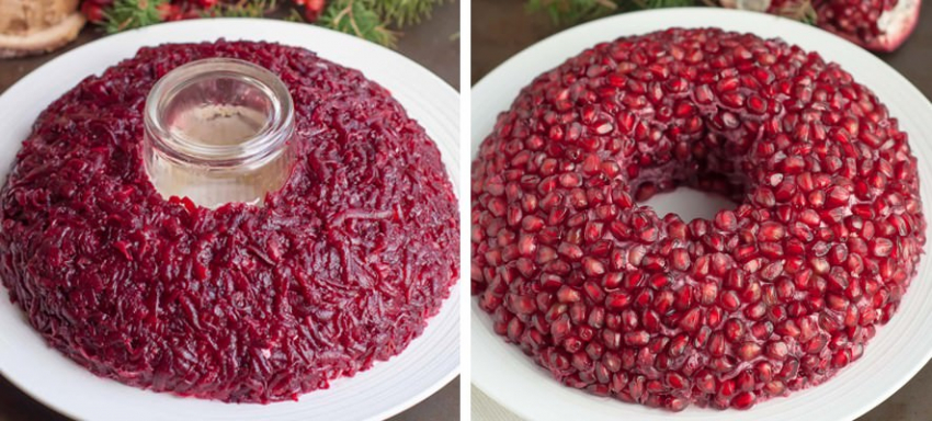 Подбираем плоское круглое блюдо, выкладываем слои. Каждый слой обмазываем прованским соусом. Первым идёт картошка, за ней морковь, после мяса, потом грибы, за ними свекла. Свеклу стягиваем небольшим количеством соуса, отправляем настаиваться на ночь на полочке в холодильнике. После вытаскиваем из середины блюда стакан и укладываем зёрна граната. Можно угощать гостей.