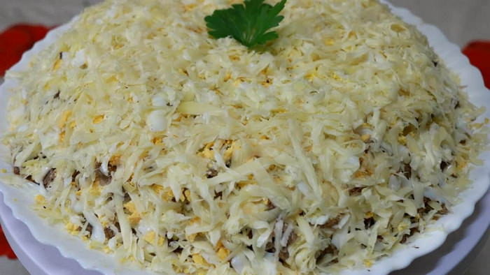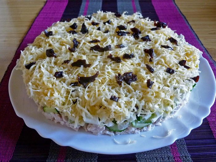 - После того как формирование салата будет готово, посыпьте салат тертым сыром и поставьте в холодильник для пропитки.