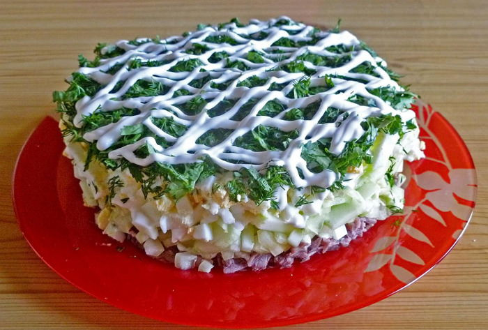 - Остывшее отварное мясо нарежьте небольшими полосками и выложите слоем поверх лука. Далее — снова сеточка из майонеза. Но не делайте ее слишком густой, если не хотите получить чересчур жирный салат.