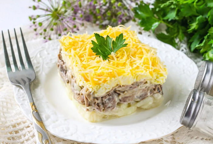 - После того как все ингредиенты будут приготовлены, их можно укладывать в слои салата.