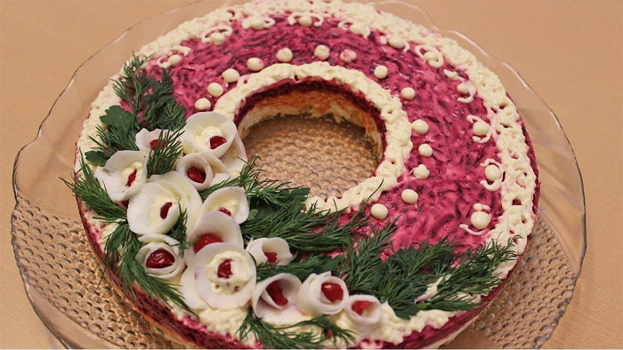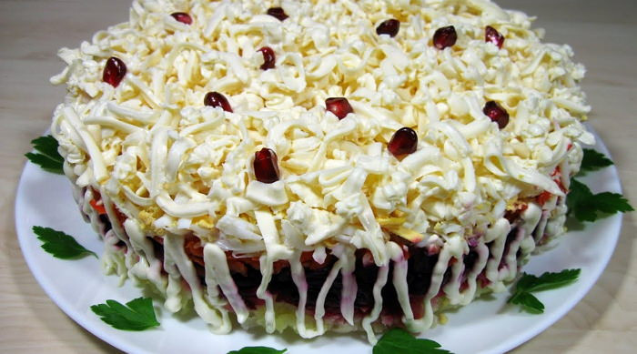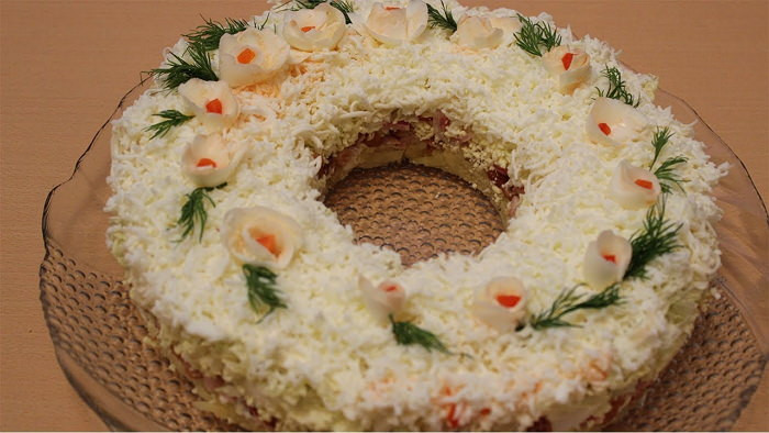 - Далее последний слой сыра, а после белок. Ну, а теперь включите смекалку и фантазию и украсьте на свой вкус.