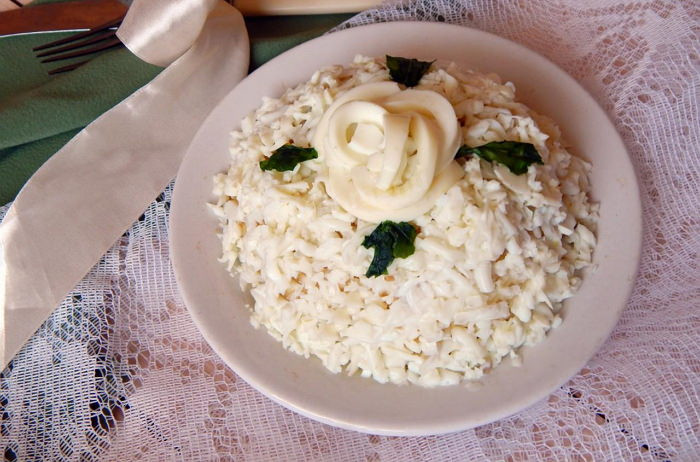 Некоторые хозяйки плавят в микроволновке твердый сыр и формируют из него различные украшения для салата. Действительно, это выглядит красиво, но вместе с тем увеличивает жирность готовой закуски, поэтому лучше делать украшения из овощей. Если хозяйка решила приготовить салат «невеста» по рецепту с курицей, следует иметь в виду, что копченое мясо птицы содержит больше соли, чем отварное. Поэтому солить салат с копчеными ингредиентами надо меньше, чем ту же закуску с отварным мясом.