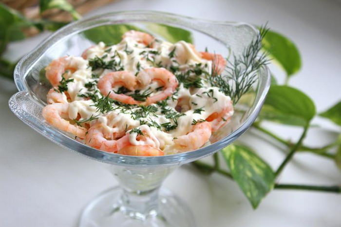 - Креветки очистить, оставив немного для украшения. Выложить салат в салатницу слоями.