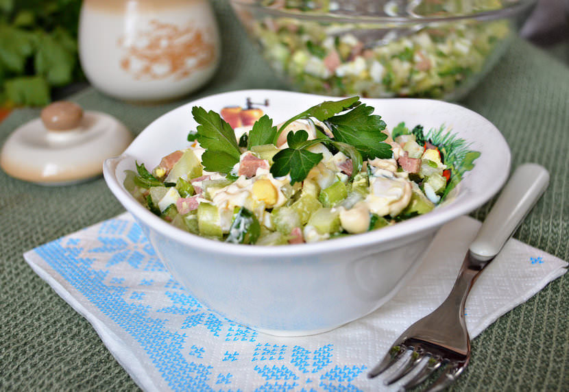 - Затем посолите салат и заправьте майонезом. Выбрать сорт майонеза вы можете по желанию, но для такого салата лучше приобретать нежирный и легкий майонез.
