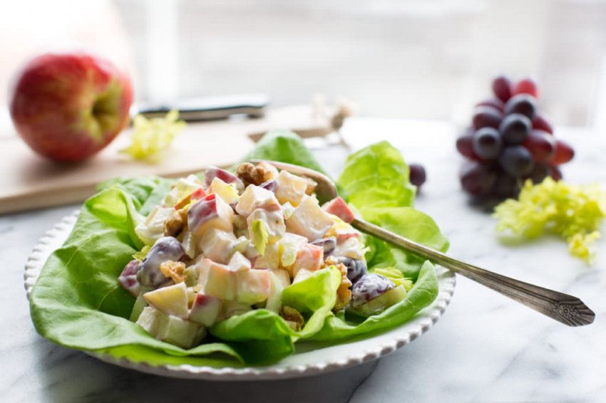 - Очистите от кожицы сочные яблоки, а также корень сельдерея. Последний порежьте тонкими полосками, а фрукты — небольшими кубиками. Сбрызните все свежевыжатым лимонным соком. Снимите с апельсина кожуру, освободите его от белой пленки, после нарежьте средники кусками. Теперь соедините в одной посуде все ингредиенты, слегка посолите, приправьте итальянскими или салатными специями, затем добавьте соус. Для его приготовления смешайте нежирный майонез, сметану.