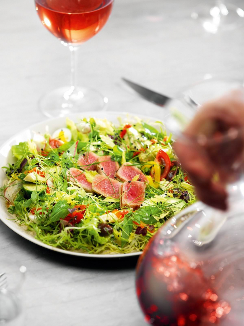 - В самом конце выложить обжаренного тунца, сбрызнуть его оливковым маслом, соевым соусом, украсить листьями сельдерея и кресс-салатом — и полить медово-бальзамическим дрессингом.
