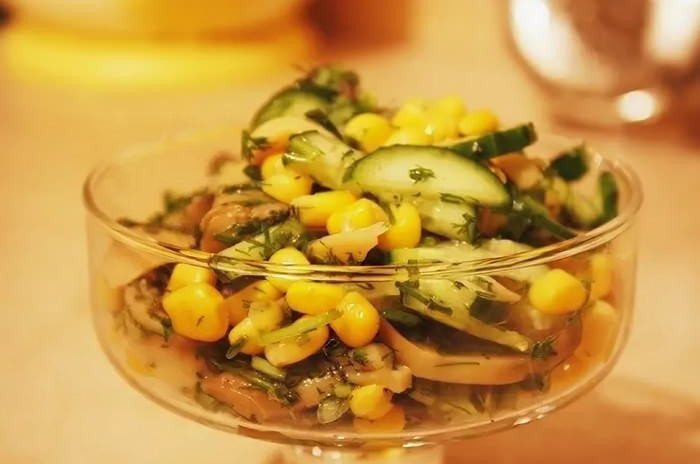 - Кукурузу и опята отделите от жидкости. Смешайте все ингредиенты в миске, заправьте оливковым маслом.