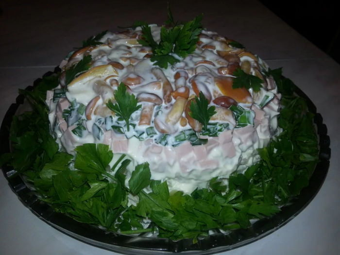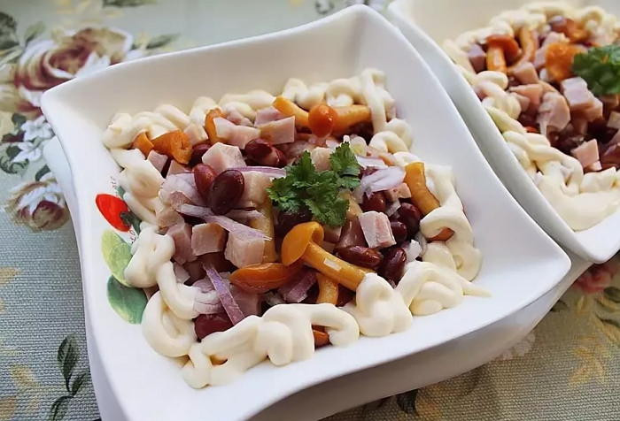 - Выкладываем салат с маринованными опятами, ветчиной и фасолью в салатницу и подаем к столу. Надеюсь, вам понравится этот нехитрый салатик.