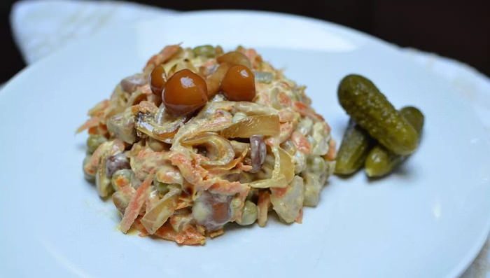- Выложить готовый салат с маринованными опятами и курицей в салатник. Сверху украсить целыми маринованными опятами.