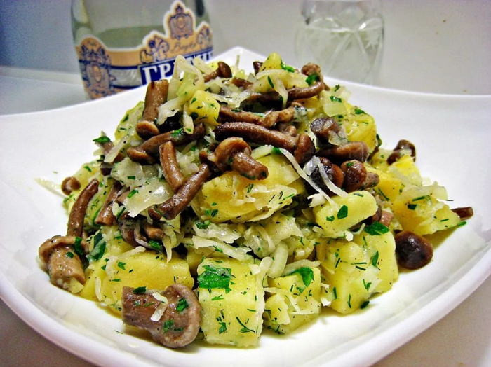 Способы приготовления салата с маринованными опятами достаточно легкие, но при этом очень разнообразные. Вкуснейшие грибочки станут яркой составляющей, как салатов из трех ингредиентов, так и сложных рецептов с большим количеством продуктов. Опята хороши с разными заправками, будь-то масло, майонез или сметана.