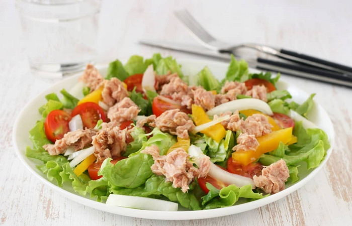 - Кусочки консервированного тунца (без жидкости) немного разомнем вилкой выложим в салат.