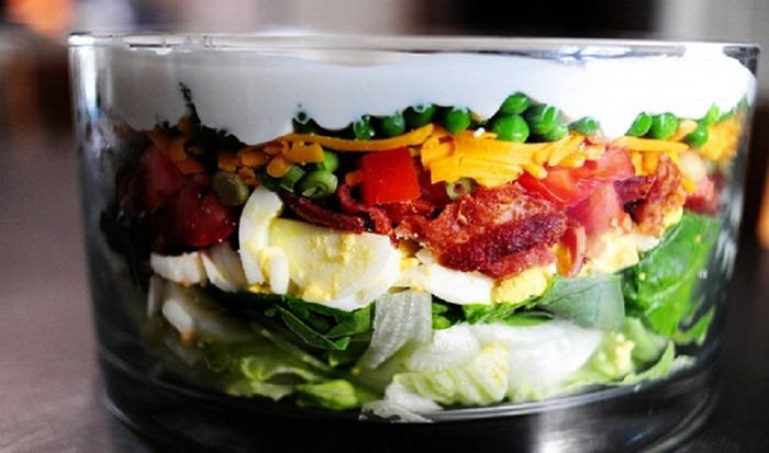 - Укроп и зеленый лук мелко порубить. В глубокую салатницу выкладывать слоями ингредиенты: листья айсберга, шпинат, яйца, бекон, помидоры, зеленый лук. Сверху посыпать тертым сыром. Последний слой — зеленый горошек. Повторять до тех пор, пока салатник не заполнится до краев.