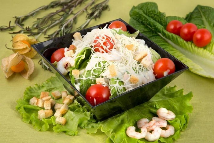 - Салат айсберг нарвать крупными кусочками. Смешать с помидорами, разрезанными на четыре части, соусом и гренками. Выложить на блюдо, сверху уложить креветки, посыпать стружкой пармезана.