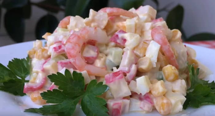- Крабовый салат с огурцами выкладываем на тарелку, украшаем зеленью и креветками. Крабовый салат с креветками готов.