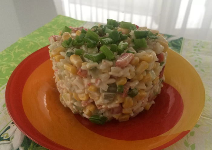 - В салатницу выкладываем крабовые палочки, яйца, отварной рис, огурец. Добавляем баночку консервированной кукурузы. Для свежести можно добавить пару перышек зеленого лука и укропа.