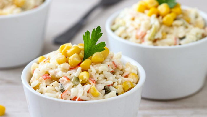 - Отварить рис в подсоленной воде. Остудить его, переложить в большую миску, в которой будет удобно размешивать салат