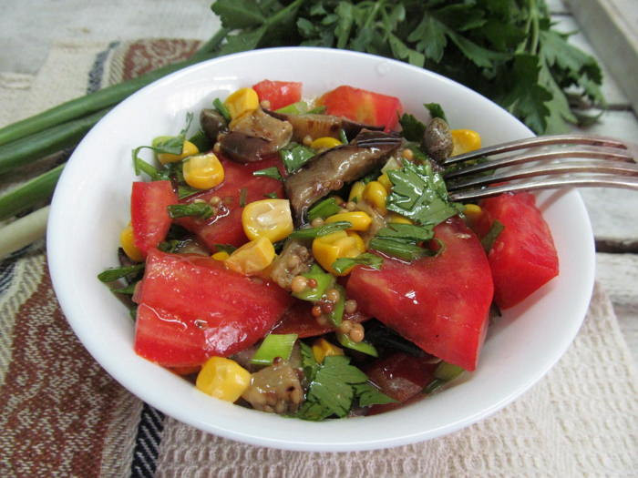 - Сверху выложите кукурузные зерна, посыпьте закуску рубленой зеленью.